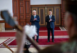 واستُقبل الضيف الرفيع المستوى أيضاً وفق العادات الوطنية التي تجسد التراث الثقافي الغني للشعب القرغيزي.